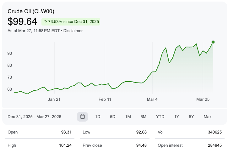 The Strait is the transit point for roughly 25% of the world’s liquid natural gas (LNG) and 20% of its oil. With these supplies stranded, Brent crude has surged past $112 a barrel.